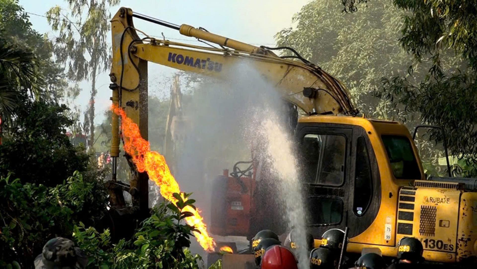 Các thành viên trong gia đình dùng bom xăng, xe cuốc và hung khí tấn công lực lượng chức năng, khiến năm cán bộ, chiến sĩ bị thương. Nhiều phương tiện và máy móc của đơn vị thi công cũng bị hư hại nghiêm trọng.